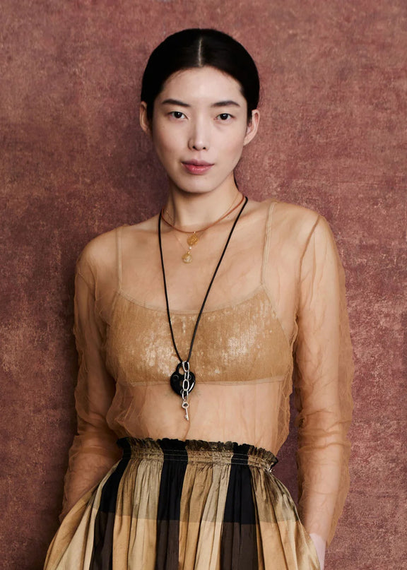 The luca crinkle mesh blouse is sheer with a distinctive crinkle texture. Perfectly layers over the collection's silk dress or with a favorite bralette. Materials & Specs: