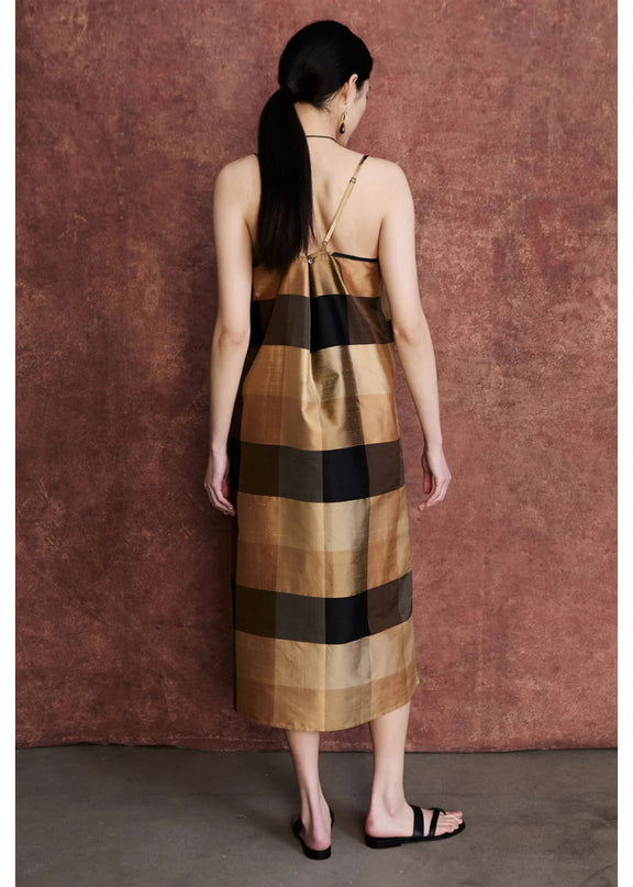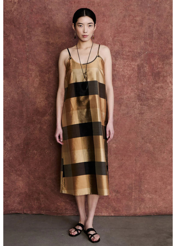 This Chan Luu silk slip dress is an inspired take on a classic silhouette with a black and gold plaid check pattern. The draped body effortlessly flatters, with adjustable straps so you can create your perfect fit! Materials & Specs: