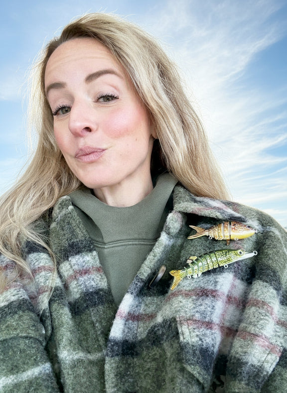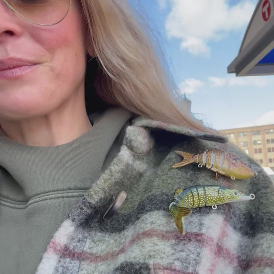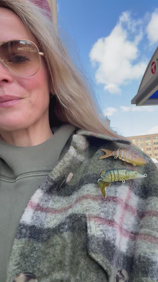 From the latest MELKE collection, this brooch is made from a genuine fishing lure and is perfect to pin to any jacket lapel, sweater, or scarf. Materials & Specs: