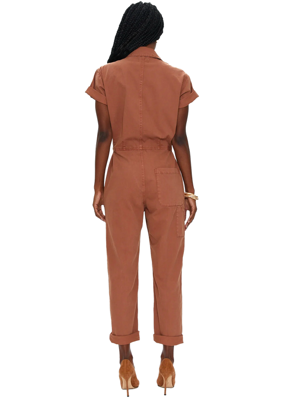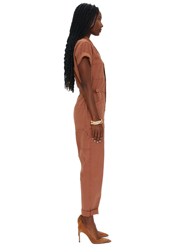 Grover is a bestselling jumpsuit for a reason! This button-closure, workwear-inspired one piece comes in this gorgeous cinnamon color - wear it any time of the year. With adjustable straps on the side, the grover can be worn cinched at the waist or straight through the midsection for an easy fit. Materials & Specs: