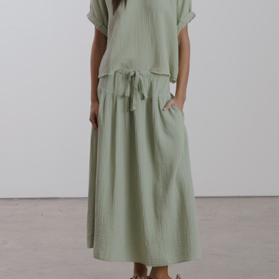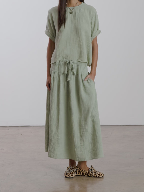 The irene skirt is a timeless piece in the coziest gauzy fabrication. She has an a-line silhouette and tie-waist for versatility. Be an outfit repeater, no embarrassment necessary. Materials & Specs: